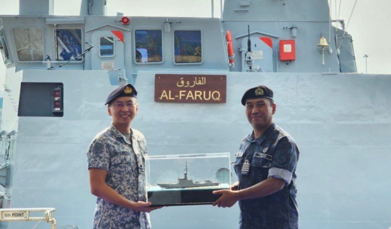 Rear Admiral Sean Watt initiated the ceremony with his opening remarks which was reciprocated by RBN Acting Commander’s remarks reaffirming the strong ties between both navies. The ceremony continued with the signing of the Certificate of Transfer between them. RBN Acting Commander then delivered the citation for naming the patrol vessel AL-FARUQ. The Negara Brunei Darussalam national flag and RBN Ensign was handed over to Lieutenant Commander Pg. Khairul Anwar bin Pg. Dr. Hj. Abu Bakar, RBN, Commanding Officer of AL-FARUQ and hoisted onboard AL-FARUQ and followed with the commencement of Azan and Doa to bless the event. The ceremony continued with the presentation of the Symbol of Transfer by the RSN Chief to the RBN Acting Commander and followed by group photo session.